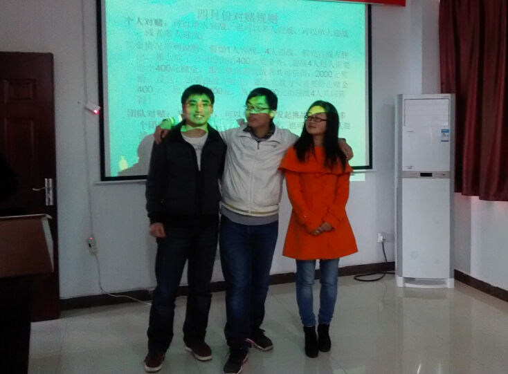 2015年4月3日于公司培訓(xùn)室召開月度銷售PK活動(dòng),活動(dòng)介紹了新來員工,評(píng)選出3月銷售前三名和團(tuán)隊(duì)銷售冠軍并開展了有益身心的小游戲,場面活潑,氛圍熱烈。